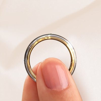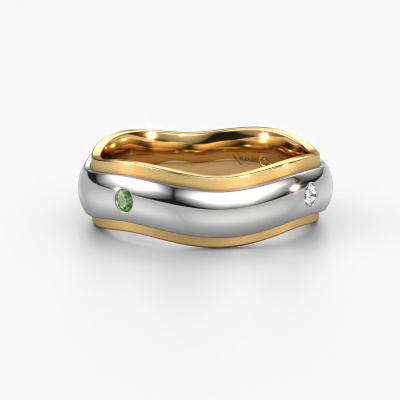 Wat een prachtige combinatie van twee edelmetalen, die elkaar zo mooi versterken in de unieke vormgeving van deze ring! Onze goudsmid vindt het bijzonder om voor jou een unieke trouwring te vervaardigen, die jij zelf hebt samengesteld. Elke dames trouwring die wij leveren is in ons eigen atelier ambachtelijk met de hand gemaakt. Hierdoor is het mogelijk om al je wensen te verwezenlijken in jouw persoonlijke ring, die bij jouw stijl past. In deze unieke WH2050L26DP trouwring is ronde toermalijn groen geplaatst, hij is ±6 mm breed en heeft een glimmende afwerking. U kunt deze dames trouwring zelf samenstellen in verschillende edelmetaal combinaties, deze heeft de combinatie 14 karaat witgoud met goud. Nadat jij jouw ring hebt samengesteld, gaat onze sieradenontwerper hiermee aan de slag. Hij maakt een 3D tekening van jouw trouwring. Deze kunnen we ook gebruiken om een dummy te maken van je ring. Je hebt namelijk de mogelijkheid een dummy te bestellen, zodat je al van tevoren kunt zien hoe jouw ring uiteindelijk wordt. Vervolgens vervaardigt onze vakkundige goudsmid jouw ring in ons atelier. Wij maken gebruik van eerlijk gewonnen goud, zodat jij een ring krijgt waar we zowel op de binnenkant als buitenkant trots op zijn. Overigens kun je ook eigen goud aanleveren. Omdat wij jouw ring met de hand maken, kunnen we je eigen goud hierin gebruiken. Ons doel is om een prachtige glanzende trouwring te creëren, zoals jij deze in gedachte had!Heb je nog meer wensen voor je trouwring en kun je deze hier niet terug vinden? Neem gerust contact op met onze designers! Zo kunnen we een ring juist mat maken, breder of smaller. Ook gravures zijn in de meeste gevallen mogelijk. En heb je een eigen idee voor mooie trouwringen? Onze sieradenontwerpers vinden het een prachtige uitdaging om jouw ring helemaal naar jouw voorstelling te ontwerpen!Doordat wij alle trouwringen pas vervaardigen, zodra een bestelling geplaatst wordt, hebben wij geen dure voorraden. Ook worden alle sieraden in eigen atelier naar ambachtelijk vakmanschap gemaakt. Hierdoor kunnen we jou een beste prijsgarantie leveren, de prijs ligt 30% lager dan bij andere juweliers. En dat terwijl jouw trouwringen geleverd worden in de vertrouwde juwelierskwaliteit!Om het voor jou makkelijker te maken kun je ieder besteld sieraad binnen 30 dagen na aflevering eenvoudig weer retour sturen.