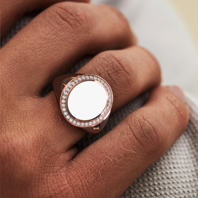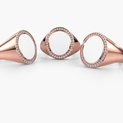De bovenstaande ovale Adam 3 zegel ring met ovale vorm witte emaille bovenkant staat bol van traditie. De zegel ring werd van oudsher van vader op zoon doorgegeven. Met deze ovale rosé gouden zegel ring start je je eigen traditie. Ook plaatsen we graag een gravure voor je, zoals een monogram of een familiewapen gravure. Kijk voor meer informatie en de mogelijkheden hiervan bij onze kennisbank. De verschillende afdelingen binnen de kennisbank vind je onderaan deze pagina. Jouw traditie begint hier, met de exclusieve rosé gouden Adam 3 zegel ring. Jouw persoonlijke diamanten Adam 3 zegelring stel je zelf samen, en wordt met liefde en passie door onze goudsmeden vervaardigd. Wil je liever een andere optie dan de hier afgebeelde rosé gouden Adam 3 zegelring? Dan heb je via de configurator keuze uit diverse mogelijkheden. Kom je er niet helemaal uit, dan dienen wij je graag van advies!Elke dag worden nieuwe ring ontwerpen toegevoegd aan de site door ons team van talentvolle en gepassioneerde ontwerpers. Hierbij wordt ernaar gestreefd om een zo gevarieerd mogelijke collectie aan te bieden. Heb je bepaalde ideeën voor een ring, neem dan eens contact op voor een offerte. Wij doen je een aanbod wat betreft prijs en kwaliteit waar je geen nee tegen zult kunnen zeggen.Omdat wij zelf alle sieraden maken en direct aan jou leveren, kunnen wij je een ring leveren tegen een prijs die je nergens anders zult tegenkomen. Een ring wordt pas gemaakt als we een bestelling krijgen, hierdoor hebben wij geen dure voorraden en kunnen wij jou de beste prijs garanderen. Wij begrijpen dat het kopen van een sieraad online spannend is, en denken graag met je mee over de mogelijkheden binnen jouw budget.Om het voor jou makkelijker te maken kun je ieder besteld sieraad binnen 30 dagen na aflevering eenvoudig weer retour sturen.