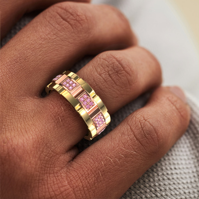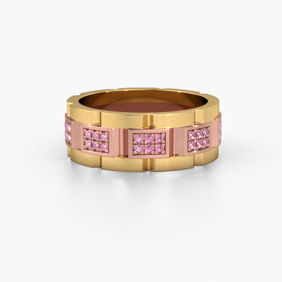 Everyone knows the design of this well-known watch brand. Met zijn schakels in twee kleuren rosé goud, past deze 2 kleuren 14 karaat rosé gouden Ricardo 3 heren ring bij de moderne, succesvolle man. Een man die een statement wil maken met een opvallende heren ring met 1.2 mm roze saffier. Laat zien wie je bent!Onze goudsmeden vervaardigen met veel passie en zorgvuldigheid jouw heren ring op maat en naar eigen wens. De rosé gouden heren ring zoals hier is afgebeeld, kan naar jouw wens worden aangepast met de configurator. Heb je bepaalde ideeën die je met de configurator niet kunt toepassen, dan kun je dit altijd even opnemen met onze sieradenontwerpers. Met vragen kun je uiteraard ook altijd terecht.
