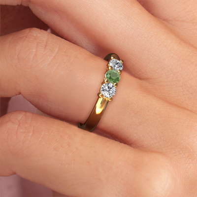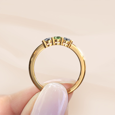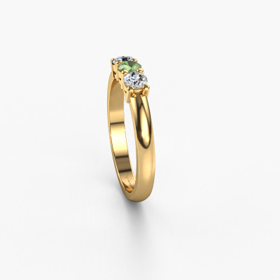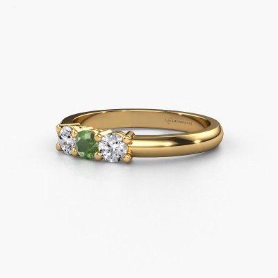 Deze 3 steens ring heeft de naam Michelle 3. Dit type ring wordt een 'alliance' ring genoemd, omdat hij recht is uitgevoerd. Hierdoor kan de ring samen met andere ringen gedragen worden. Deze ring is uitgevoerd in 14 karaat goud en heeft toermalijn groen in combinatie met lab-grown diamant ter grootte van 3.7 mm in de band. Zoals je ziet, worden er bij deze prachtige gouden alliance ring toermalijn groen naast elkaar op de ring gezet. De betekenis van alliance is letterlijk 'samenwerken'. En dat is precies wat deze edelstenen doen: samen creëren ze op de band een extra bijzonder effect bij een klassieke ring! Een prachtige symboliek voor een ring, toch? Alle zorgvuldig geselecteerde toermalijn groen worden met de hand geplaatst door onze meester goudsmid. Een zeer precies werkje, dat alleen door onze unieke combinatie van puur vakmanschap en de modernste technieken het optimale effect krijgt. Alle edelstenen moeten namelijk precies op dezelfde manier geplaatst worden om het licht perfect te verspreiden. Daarom zal de goudsmid deze ring steeds weer tegen het licht houden om te zien of de toermalijn groen juist geplaatst zijn. Het vraagt een vaardige hand en veel geduld, maar het resultaat is een echt meesterstuk. En daar gaan we voor!Ben je gebonden aan een bepaald budget? Neem gerust contact met ons op, we adviseren graag over alle mogelijkheden. Sowieso leveren wij alle ringen tegen een prijs die je nergens anders tegen komt, doordat we de ring pas vervaardigen wanneer je deze besteld. Hierdoor kunnen wij je een beste prijs garantie geven.