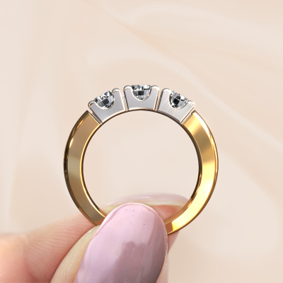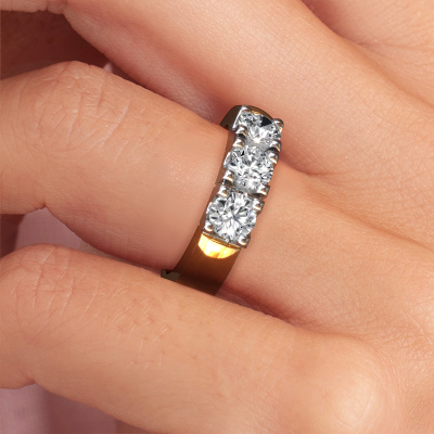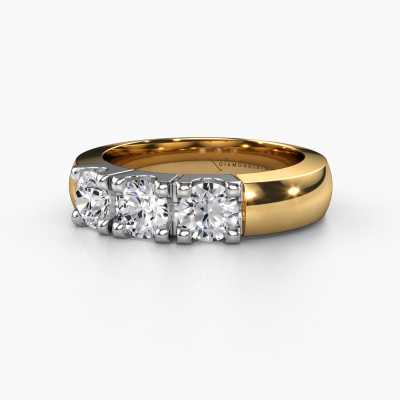 Deze 3 steens ring heeft de naam Rianne 3. Dit type ring wordt een 'alliance' ring genoemd, omdat hij recht is uitgevoerd. Hierdoor kan de ring samen met andere ringen gedragen worden. Deze ring is uitgevoerd in 14 karaat goud en heeft diamant in combinatie met diamant ter grootte van 0.40 crt in de band. Zoals je ziet, worden er bij deze prachtige gouden alliance ring diamanten naast elkaar op de ring gezet. De betekenis van alliance is letterlijk 'samenwerken'. En dat is precies wat deze edelstenen doen: samen creëren ze op de band een extra bijzonder effect bij een klassieke ring! Een prachtige symboliek voor een ring, toch? Alle zorgvuldig geselecteerde diamanten worden met de hand geplaatst door onze meester goudsmid. Een zeer precies werkje, dat alleen door onze unieke combinatie van puur vakmanschap en de modernste technieken het optimale effect krijgt. Alle edelstenen moeten namelijk precies op dezelfde manier geplaatst worden om het licht perfect te verspreiden. Daarom zal de goudsmid deze ring steeds weer tegen het licht houden om te zien of de diamanten juist geplaatst zijn. Het vraagt een vaardige hand en veel geduld, maar het resultaat is een echt meesterstuk. En daar gaan we voor!Met veel passie gaan onze edelsmeden met jouw ring aan de slag in ons atelier, zodra je deze besteld hebt. Doordat we geen sieraden op voorraad hebben, hoeven we de voorraad niet door te berekenen in de prijs. En dat zie je terug in de prijs! We geven je graag een beste prijsgarantie.Elke dag worden nieuwe ring ontwerpen toegevoegd aan de site door ons team van talentvolle en gepassioneerde ontwerpers. Hierbij wordt ernaar gestreefd om een zo gevarieerd mogelijke collectie aan te bieden. Heb je bepaalde ideeën voor een ring, neem dan eens contact op voor een offerte. Wij doen je een aanbod wat betreft prijs en kwaliteit waar je geen nee tegen zult kunnen zeggen.Om het voor jou makkelijker te maken kun je ieder besteld sieraad binnen 30 dagen na aflevering eenvoudig weer retour sturen. '