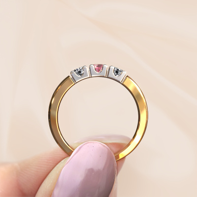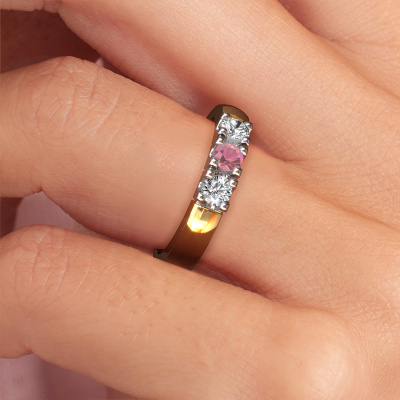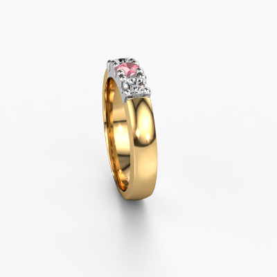 Deze 3 steens ring heeft de naam Rianne 3. Dit type ring wordt een 'alliance' ring genoemd, omdat hij recht is uitgevoerd. Hierdoor kan de ring samen met andere ringen gedragen worden. Deze ring is uitgevoerd in 14 karaat goud en heeft tourmalijn pink in combinatie met diamant ter grootte van 3.4 mm in de band. Zoals je ziet, worden er bij deze prachtige gouden alliance ring tourmalijn pink naast elkaar op de ring gezet. De betekenis van alliance is letterlijk 'samenwerken'. En dat is precies wat deze edelstenen doen: samen creëren ze op de band een extra bijzonder effect bij een klassieke ring! Een prachtige symboliek voor een ring, toch? Alle zorgvuldig geselecteerde tourmalijn pink worden met de hand geplaatst door onze meester goudsmid. Een zeer precies werkje, dat alleen door onze unieke combinatie van puur vakmanschap en de modernste technieken het optimale effect krijgt. Alle edelstenen moeten namelijk precies op dezelfde manier geplaatst worden om het licht perfect te verspreiden. Daarom zal de goudsmid deze ring steeds weer tegen het licht houden om te zien of de tourmalijn pink juist geplaatst zijn. Het vraagt een vaardige hand en veel geduld, maar het resultaat is een echt meesterstuk. En daar gaan we voor!Met veel passie gaan onze edelsmeden met jouw ring aan de slag in ons atelier, zodra je deze besteld hebt. Doordat we geen sieraden op voorraad hebben, hoeven we de voorraad niet door te berekenen in de prijs. En dat zie je terug in de prijs! We geven je graag een beste prijsgarantie.Elke dag worden nieuwe ring ontwerpen toegevoegd aan de site door ons team van talentvolle en gepassioneerde ontwerpers. Hierbij wordt ernaar gestreefd om een zo gevarieerd mogelijke collectie aan te bieden. Heb je bepaalde ideeën voor een ring, neem dan eens contact op voor een offerte. Wij doen je een aanbod wat betreft prijs en kwaliteit waar je geen nee tegen zult kunnen zeggen.Om het voor jou makkelijker te maken kun je ieder besteld sieraad binnen 30 dagen na aflevering eenvoudig weer retour sturen. '