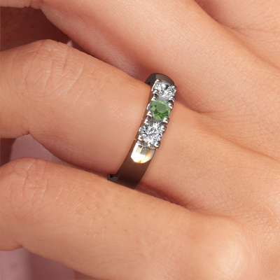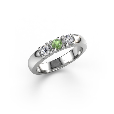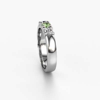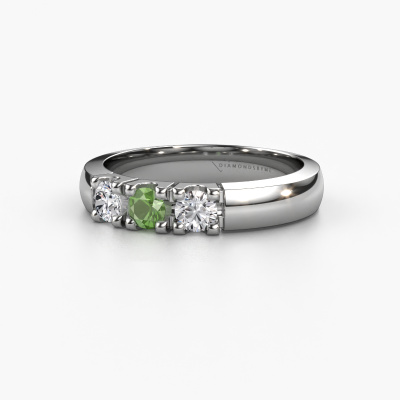Deze 3 steens ring heeft de naam Rianne 3. Dit type ring wordt een 'alliance' ring genoemd, omdat hij recht is uitgevoerd. Hierdoor kan de ring samen met andere ringen gedragen worden. Deze ring is uitgevoerd in platina en heeft toermalijn groen in combinatie met diamant ter grootte van 3.4 mm in de band. Zoals je ziet, worden er bij deze prachtige platina alliance ring toermalijn groen naast elkaar op de ring gezet. De betekenis van alliance is letterlijk 'samenwerken'. En dat is precies wat deze edelstenen doen: samen creëren ze op de band een extra bijzonder effect bij een klassieke ring! Een prachtige symboliek voor een ring, toch? Alle zorgvuldig geselecteerde toermalijn groen worden met de hand geplaatst door onze meester goudsmid. Een zeer precies werkje, dat alleen door onze unieke combinatie van puur vakmanschap en de modernste technieken het optimale effect krijgt. Alle edelstenen moeten namelijk precies op dezelfde manier geplaatst worden om het licht perfect te verspreiden. Daarom zal de goudsmid deze ring steeds weer tegen het licht houden om te zien of de toermalijn groen juist geplaatst zijn. Het vraagt een vaardige hand en veel geduld, maar het resultaat is een echt meesterstuk. En daar gaan we voor!Met veel passie gaan onze edelsmeden met jouw ring aan de slag in ons atelier, zodra je deze besteld hebt. Doordat we geen sieraden op voorraad hebben, hoeven we de voorraad niet door te berekenen in de prijs. En dat zie je terug in de prijs! We geven je graag een beste prijsgarantie.Elke dag worden nieuwe ring ontwerpen toegevoegd aan de site door ons team van talentvolle en gepassioneerde ontwerpers. Hierbij wordt ernaar gestreefd om een zo gevarieerd mogelijke collectie aan te bieden. Heb je bepaalde ideeën voor een ring, neem dan eens contact op voor een offerte. Wij doen je een aanbod wat betreft prijs en kwaliteit waar je geen nee tegen zult kunnen zeggen.Om het voor jou makkelijker te maken kun je ieder besteld sieraad binnen 30 dagen na aflevering eenvoudig weer retour sturen. '