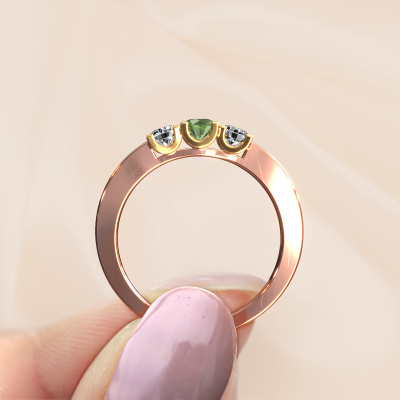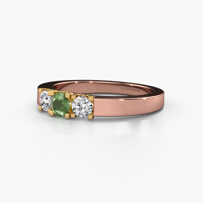 Deze 3 steens ring heeft de naam Selina 1. Dit type ring wordt een 'alliance' ring genoemd, omdat hij recht is uitgevoerd. Hierdoor kan de ring samen met andere ringen gedragen worden. Deze ring is uitgevoerd in 14 karaat rosé goud en heeft toermalijn groen in combinatie met diamant ter grootte van 3.7 mm in de band. Zoals je ziet, worden er bij deze prachtige rosé gouden alliance ring toermalijn groen naast elkaar op de ring gezet. De betekenis van alliance is letterlijk 'samenwerken'. En dat is precies wat deze edelstenen doen: samen creëren ze op de band een extra bijzonder effect bij een moderne ring! Een prachtige symboliek voor een ring, toch? Alle zorgvuldig geselecteerde toermalijn groen worden met de hand geplaatst door onze meester goudsmid. Een zeer precies werkje, dat alleen door onze unieke combinatie van puur vakmanschap en de modernste technieken het optimale effect krijgt. Alle edelstenen moeten namelijk precies op dezelfde manier geplaatst worden om het licht perfect te verspreiden. Daarom zal de goudsmid deze ring steeds weer tegen het licht houden om te zien of de toermalijn groen juist geplaatst zijn. Het vraagt een vaardige hand en veel geduld, maar het resultaat is een echt meesterstuk. En daar gaan we voor!Door onze modernste technieken kunnen wij met uiterste precisie prachtige sieraden te ontwerpen en voor jou personaliseren in de hoogste juwelierskwaliteit. Tegelijkertijd zijn onze ringen altijd 30% goedkoper dan bij een andere juwelier. Dit komt doordat alle ringen pas vervaardigd worden op het moment dat deze besteld wordt en we daardoor geen dure voorraden hoeven te hanteren. Mocht je aan een bepaald budget gebonden zijn, kunnen we je graag adviseren welke combinatie je het beste kunt kiezen.Iedere dag worden nieuwe sieraad ontwerpen toegevoegd aan de website. Ons team van gepassioneerde designers streeft ernaar om tot de mooiste ontwerpen te komen, en een zo gevarieerd mogelijk aanbod. Heb je ergens een ring gezien welke je wilt laten maken, stuur ons dan bericht. Wij sturen je graag een offerte toe. Hierin bieden wij de beste prijs en kwaliteit. Je zult dit zeker niet kunnen afslaan!Om het voor jou makkelijker te maken kun je ieder besteld sieraad binnen 30 dagen na aflevering eenvoudig weer retour sturen. '