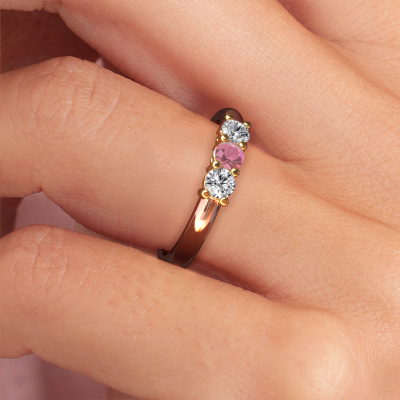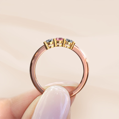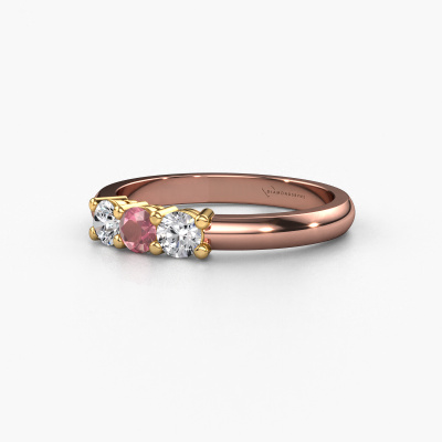 Deze 3 steens ring heeft de naam Michelle 3. Dit type ring wordt een 'alliance' ring genoemd, omdat hij recht is uitgevoerd. Hierdoor kan de ring samen met andere ringen gedragen worden. Deze ring is uitgevoerd in 14 karaat rosé goud en heeft tourmalijn pink in combinatie met lab-grown diamant ter grootte van 3.7 mm in de band. Zoals je ziet, worden er bij deze prachtige rosé gouden alliance ring tourmalijn pink naast elkaar op de ring gezet. De betekenis van alliance is letterlijk 'samenwerken'. En dat is precies wat deze edelstenen doen: samen creëren ze op de band een extra bijzonder effect bij een klassieke ring! Een prachtige symboliek voor een ring, toch? Alle zorgvuldig geselecteerde tourmalijn pink worden met de hand geplaatst door onze meester goudsmid. Een zeer precies werkje, dat alleen door onze unieke combinatie van puur vakmanschap en de modernste technieken het optimale effect krijgt. Alle edelstenen moeten namelijk precies op dezelfde manier geplaatst worden om het licht perfect te verspreiden. Daarom zal de goudsmid deze ring steeds weer tegen het licht houden om te zien of de tourmalijn pink juist geplaatst zijn. Het vraagt een vaardige hand en veel geduld, maar het resultaat is een echt meesterstuk. En daar gaan we voor!Ben je gebonden aan een bepaald budget? Neem gerust contact met ons op, we adviseren graag over alle mogelijkheden. Sowieso leveren wij alle ringen tegen een prijs die je nergens anders tegen komt, doordat we de ring pas vervaardigen wanneer je deze besteld. Hierdoor kunnen wij je een beste prijs garantie geven.