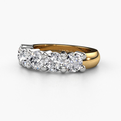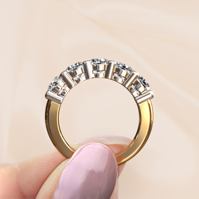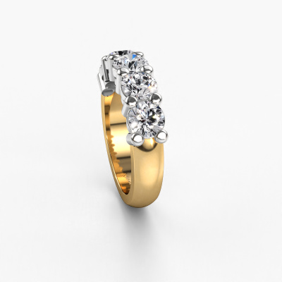 Deze 5 steens ring heeft de naam Michelle 5. Dit type ring wordt een 'alliance' ring genoemd, omdat hij recht is uitgevoerd. Hierdoor kan de ring samen met andere ringen gedragen worden. Deze ring is uitgevoerd in 14 karaat goud en heeft diamant in combinatie met lab-grown diamant ter grootte van 0.50 crt in de band. Zoals je ziet, worden er bij deze prachtige gouden alliance ring diamanten naast elkaar op de ring gezet. De betekenis van alliance is letterlijk 'samenwerken'. En dat is precies wat deze edelstenen doen: samen creëren ze op de band een extra bijzonder effect bij een klassieke ring! Een prachtige symboliek voor een ring, toch? Alle zorgvuldig geselecteerde diamanten worden met de hand geplaatst door onze meester goudsmid. Een zeer precies werkje, dat alleen door onze unieke combinatie van puur vakmanschap en de modernste technieken het optimale effect krijgt. Alle edelstenen moeten namelijk precies op dezelfde manier geplaatst worden om het licht perfect te verspreiden. Daarom zal de goudsmid deze ring steeds weer tegen het licht houden om te zien of de diamanten juist geplaatst zijn. Het vraagt een vaardige hand en veel geduld, maar het resultaat is een echt meesterstuk. En daar gaan we voor!Ben je gebonden aan een bepaald budget? Neem gerust contact met ons op, we adviseren graag over alle mogelijkheden. Sowieso leveren wij alle ringen tegen een prijs die je nergens anders tegen komt, doordat we de ring pas vervaardigen wanneer je deze besteld. Hierdoor kunnen wij je een beste prijs garantie geven.