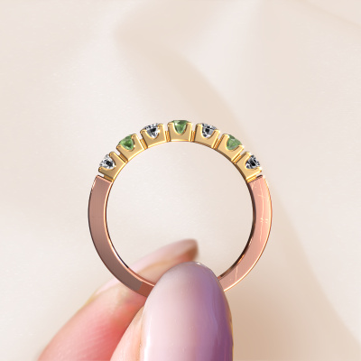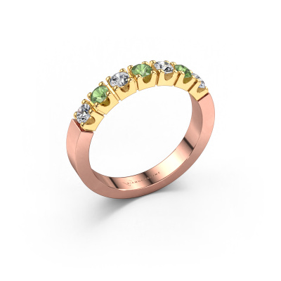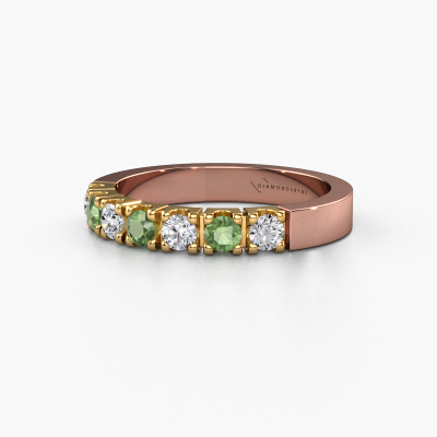 Deze 7 steens ring heeft de naam Dana 7. Dit type ring wordt een 'alliance' ring genoemd, omdat hij recht is uitgevoerd. Hierdoor kan de ring samen met andere ringen gedragen worden. Deze ring is uitgevoerd in 14 karaat rosé goud en heeft toermalijn groen in combinatie met lab-grown diamant ter grootte van 3 mm in de band. Zoals je ziet, worden er bij deze prachtige rosé gouden alliance ring toermalijn groen naast elkaar op de ring gezet. De betekenis van alliance is letterlijk 'samenwerken'. En dat is precies wat deze edelstenen doen: samen creëren ze op de band een extra bijzonder effect bij een moderne ring! Een prachtige symboliek voor een ring, toch? Alle zorgvuldig geselecteerde toermalijn groen worden met de hand geplaatst door onze meester goudsmid. Een zeer precies werkje, dat alleen door onze unieke combinatie van puur vakmanschap en de modernste technieken het optimale effect krijgt. Alle edelstenen moeten namelijk precies op dezelfde manier geplaatst worden om het licht perfect te verspreiden. Daarom zal de goudsmid deze ring steeds weer tegen het licht houden om te zien of de toermalijn groen juist geplaatst zijn. Het vraagt een vaardige hand en veel geduld, maar het resultaat is een echt meesterstuk. En daar gaan we voor!Met veel passie gaan onze edelsmeden met jouw ring aan de slag in ons atelier, zodra je deze besteld hebt. Doordat we geen sieraden op voorraad hebben, hoeven we de voorraad niet door te berekenen in de prijs. En dat zie je terug in de prijs! We geven je graag een beste prijsgarantie.Elke dag worden nieuwe ring ontwerpen toegevoegd aan de site door ons team van talentvolle en gepassioneerde ontwerpers. Hierbij wordt ernaar gestreefd om een zo gevarieerd mogelijke collectie aan te bieden. Heb je bepaalde ideeën voor een ring, neem dan eens contact op voor een offerte. Wij doen je een aanbod wat betreft prijs en kwaliteit waar je geen nee tegen zult kunnen zeggen.Om het voor jou makkelijker te maken kun je ieder besteld sieraad binnen 30 dagen na aflevering eenvoudig weer retour sturen. '