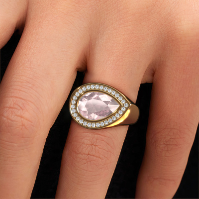 Wil je een mooie, bijzondere ring met een enkele edelsteen als eyecatcher? Wat denk je dan van deze Latashia ring? De Latashia ring zie je hier afgebeeld in goud met een prachtige 12x8 mm peer morganiet champagne. De morganiet champagne wordt met zeer zorgvuldig uitgezocht door onze leveranciers van morganiet champagne, en daarna volgens het oude ambacht door de goudsmid geplaatst in de ring. Deze wordt tot in het kleinste detail afgewerkt en gepolijst totdat een unieke ring is ontstaan met een prachtige morganiet champagne. Speciaal voor jou vervaardigd! De Latashia is uniek, doordat je deze ring geheel naar eigen wensen kunt samenstellen.Jouw persoonlijke bijzondere Latashia ring stel je zelf samen, en wordt met liefde en passie door onze goudsmeden vervaardigd. Wil je liever een andere optie dan de hier afgebeelde gouden Latashia ring? Dan heb je via de configurator keuze uit diverse mogelijkheden. Kom je er niet helemaal uit, dan dienen wij je graag van advies!Door het gebruik van de modernste technieken, gecombineerd met ambachtelijk vakmanschap kunnen wij alle ringen zelf in ons atelier maken. Iedere ring wordt pas gemaakt nadat deze besteld is. Dit heeft als bijkomend voordeel dat we kunnen leveren tegen een prijs die je nergens anders tegenkomt.Om het voor jou makkelijker te maken kun je ieder besteld sieraad binnen 30 dagen na aflevering eenvoudig weer retour sturen. Heb je een vraag, kijk dan eens bij onze veelgestelde vragen. Kom je er niet uit met de configurator, of heb je specifieke wensen voor jouw persoonlijke Latashia ring, aarzel dan niet om contact met ons op te nemen!