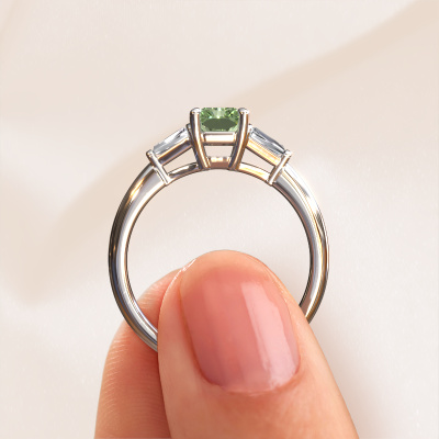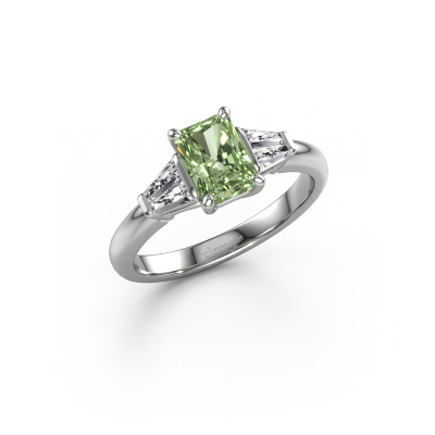 Deze verlovingsring heeft de naam Kina RAD. Deze gracieuze verlovingsring uitgevoerd, in platina is gezet met 7x5 mm groene lab grown diamant. Deze exclusieve platina 3 steens verlovingsring is een puur staaltje vakmanschap! Alle kleine details zijn door onze goudsmid met veel geduld en passie vervaardigd. Dit ambacht vraagt een deskundig oog en vaardige hand om deze verlovingsring met uiterste precisie samen te stellen. En dat is precies waar onze goudsmeden enthousiast van worden! De prachtige groene lab grown diamanten zijn op een bijzondere manier gezet, zodat deze nog beter tot zijn recht komen. Dit geeft de verlovingsring extra allure. De verlovingsring is al uniek door zijn natuurlijke edelsteen, die we speciaal geselecteerd hebben voor deze ring. Daarnaast kun je zelf de samenstelling kiezen van het edelmetaal, waardoor je uiteindelijk een unieke verlovingsring hebt gecreëerd voor de meest exclusieve vrouw in je leven! Dit sieraad is speciaal voor jou gemaakt, met aandacht voor detail en design.Wist je dat we een beste prijs garantie geven voor jouw verlovingsring? Dit is mogelijk omdat al onze sieraden met de hand gemaakt worden in ons eigen atelier. We hebben geen dure voorraden, en we maken pas je verlovingsring op het moment dat je besteld hebt. Doordat we de hele productie zelf in de hand hebben, kunnen wij je goed informeren over alle eigenschappen van deze ring. Juist omdat het kopen van een verlovingsring online spannend is, begrijpen wij dat het fijn is om alle kenmerken te weten van jouw ring.Heb je zelf een specifieke verlovingsring ergens gezien, die je graag aan jouw geliefde zou willen geven? Bespreek gerust jouw ideeën met onze sieradenontwerpers, want wij zetten graag jouw ontwerp om tot een unieke verlovingsring. Je kunt tijdens het ontwerpproces steeds meekijken, omdat wij met 3D tekeningen werken. Je krijgt hierdoor al een realistische indruk van hoe jouw ontwerp er in werkelijkheid uit komt te zien. Daarbij kun je een dummy vooraf bestellen. Een dummy is een kunststof ring, die precies dezelfde vormen heeft als jouw uiteindelijke ontwerp. Je kunt deze passen en zien of de breedte en dikte bijvoorbeeld naar wens zijn. Wij sturen je graag een vrijblijvende offerte, waarbij je ongetwijfeld versteld zult staan over de prijs en de kwaliteit van de ring en edelstenen.Om het voor jou makkelijker te maken kun je ieder besteld sieraad binnen 30 dagen na aflevering eenvoudig weer retour sturen.