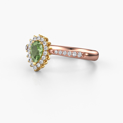 Bovenstaande verlovingsring heeft de naam Tilly per 2. Dit type verlovingsring noemen we een entourage ring. Hierbij worden rondom de middensteen in een open zetting allemaal kleine edelstenen gezet. Deze verlovingsring uitgevoerd in 14 karaat rosé goud heeft een peer toermalijn groen van 6x4 mm als center steen met daaromheen kleine diamanten. Wat deze exclusieve rosé gouden entourage verlovingsring bijzonder maakt, zijn de kleinere edelstenen die rondom de grote toermalijn groen zijn gezet in de vorm van een prachtige bloem. Hierdoor lijkt het één grote fonkelende edelsteen te vormen. Een andere naam voor deze verlovingsring is hierdoor ook wel de flower of de rozet ring. Deze kleinere diamanten moeten dan echter wel allen op dezelfde manier geplaatst zijn, zodat het licht niet onderbroken wordt in de toermalijn groen en er inderdaad een prachtige eenheid gecreëerd wordt. En daar zorgen onze meestergoudsmeden voor. Met uiterste precisie wordt iedere zorgvuldig geselecteerde toermalijn groen met de hand in de verlovingsring geplaatst. Steeds opnieuw wordt de verlovingsring onder de loep gehouden om te zien of het speciale effect nog steeds zichtbaar is. Het resultaat is een unieke verlovingsring, waarbij de gekozen toermalijn groen letterlijk het stralende middelpunt wordt. Je kunt je voorstellen dat deze verlovingsring werkelijk een betekenisvolle verlovingsring is om aan jouw liefde voor het leven te schenken! Op de dag dat jij laat zien dat zij jouw stralende middelpunt is! Dit juweel is speciaal voor jou gemaakt, met aandacht voor detail en design.Wist je dat we een beste prijs garantie geven voor jouw verlovingsring? Dit is mogelijk omdat al onze sieraden met de hand gemaakt worden in ons eigen atelier. We hebben geen dure voorraden, en we maken pas je verlovingsring op het moment dat je besteld hebt. Doordat we de hele productie zelf in de hand hebben, kunnen wij je goed informeren over alle eigenschappen van deze ring. Juist omdat het kopen van een verlovingsring online spannend is, begrijpen wij dat het fijn is om alle kenmerken te weten van jouw ring.Ons team ontwerpt dagelijks nieuwe ringen in diverse stijlen. Heb je zelf een entourage verlovingsring ergens gezien, die jij het liefst aan jouw geliefde zou willen geven? Je kunt altijd jouw ideeën en ontwerp met onze sieradenontwerpers bespreken, want wij zetten graag jouw ontwerp om tot een exclusieve verlovingsring. Je kunt tijdens het ontwerpproces steeds meekijken, omdat het ontwerp in een zeer gedetailleerde 3D tekening wordt omgezet. Daarbij kun je een dummy bestellen van het uiteindelijke ontwerp. Een dummy is een kunststof ring, die precies dezelfde vormen heeft als jouw uiteindelijke ontwerp. Je kunt deze passen en zien of de ontworpen verlovingsring helemaal naar jouw wens is. Wij sturen je graag een vrijblijvende offerte, waarbij je ongetwijfeld versteld zult staan over de prijs en de kwaliteit van de ring en edelstenen.Om het voor jou makkelijker te maken kun je ieder besteld sieraad binnen 30 dagen na aflevering eenvoudig weer retour sturen.