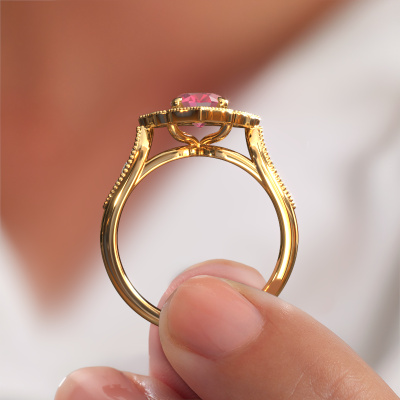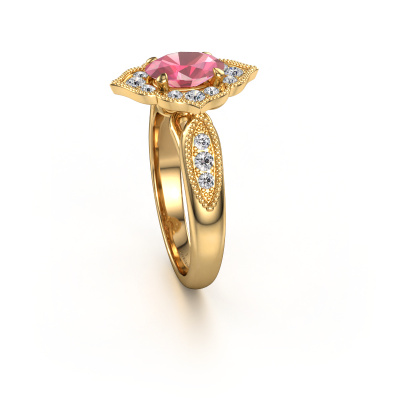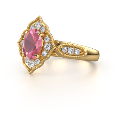 Deze verlovingsring heeft de naam Rosan. Deze verlovingsring uitgevoerd in 14 karaat goud is gezet met toermalijn pink. Een bijzondere gouden vintage ring, deze unieke verlovingsring die jouw liefde van je leven zeker laat stralen! En dat is precies waar wij voor gaan. In deze vintage verlovingsring zijn prachtige toermalijn pink verwerkt. Je kunt natuurlijk iedere edelsteen die wij aanbieden hierin laten verwerken. De edelsteen is zorgvuldig geselecteerd, want wij vinden dat op jouw verlovingsring alleen de mooiste edelsteen mag schitteren, toch? Onze goudsmid vervaardigt jouw verlovingsring in ons eigen atelier, en plaatst de toermalijn pink met uiterste precisie in de ring. Vervolgens wordt deze bijgewerkt en gepolijst totdat het resultaat zichtbaar is: de perfecte verlovingsring voor de liefde van jouw leven! Dit sieraad wordt speciaal voor jou gemaakt door onze meester goudsmeden in ons eigen atelier.Wist je dat we een beste prijs garantie geven voor jouw verlovingsring? Dit is mogelijk omdat al onze sieraden met de hand gemaakt worden in ons eigen atelier. We hebben geen dure voorraden, en we maken pas je verlovingsring op het moment dat je besteld hebt. Doordat we de hele productie zelf in de hand hebben, kunnen wij je goed informeren over alle eigenschappen van deze ring. Juist omdat het kopen van een verlovingsring online spannend is, begrijpen wij dat het fijn is om alle kenmerken te weten van jouw ring.Ons team is iedere dag weer bezig om nieuwe ontwerpen toe te voegen, in samenwerking met onze designers en goudsmeden wordt gekeken hoe we tot het mooiste ontwerp kunnen komen. Wij doen ons best om tot een zo gevarieerd mogelijk aanbod te komen. Wellicht heb je zelf al een mooi idee van een sieraad dat je ooit wel eens gezien hebt. Neem dan eens vrijblijvend contact met ons op. Wij maken een offerte voor je op waarbij wij vrij zeker zijn dat we wat betreft kwaliteit en prijs jou versteld zullen laten staan.Om het voor jou makkelijker te maken kun je ieder besteld sieraad binnen 30 dagen na aflevering eenvoudig weer retour sturen.