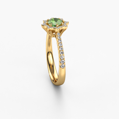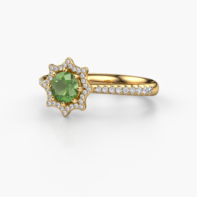 Deze aanzoeksring heeft de naam Zena. Deze aanzoeksring uitgevoerd in 14 karaat goud is gezet met toermalijn groen. Een bijzondere gouden vintage ring, deze unieke aanzoeksring die jouw liefde van je leven zeker laat stralen! En dat is precies waar