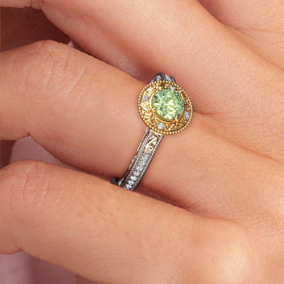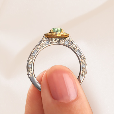 Deze verlovings ring heeft de naam Alice RND. Deze ring, uitgevoerd in 14 karaat witgoud is gezet met 5 mm groene lab grown diamant. Een bijzondere witgouden vintage ring, deze unieke verlovings ring die jouw liefde van je leven zeker laat stralen! En dat is precies waar wij voor gaan. In deze vintage verlovings ring is prachtige groene lab grown diamant verwerkt. Je kunt natuurlijk iedere edelsteen die wij aanbieden hierin laten verwerken. De edelsteen is zorgvuldig geselecteerd, want wij vinden dat op jouw parelranden verlovings ring alleen de mooiste edelsteen mag schitteren, toch? Onze goudsmid vervaardigt jouw verlovings ring in ons eigen atelier, en plaatst de groene lab grown diamant met uiterste precisie in de ring. Vervolgens wordt deze bijgewerkt en gepolijst totdat het resultaat zichtbaar is: de perfecte verlovings ring voor de liefde van jouw leven! Dit sieraad is gemaakt om aan jouw vinger te stralen, ieder sieraad wordt met liefde door onze goudsmeden met de hand gemaakt.Wellicht is het je opgevallen dat onze prijzen gemiddeld 30% lager liggen dan bij een andere juwelier. En dat terwijl de kwaliteit in de meeste gevallen nog beter is! Dit komt doordat onze goudsmeden je verlovings ring direct in ons eigen atelier vervaardigen. Hierdoor hoeven we geen dure voorraden te hanteren en kunnen we ieder gewenst detail direct op jouw verlovings ring aanbrengen.Iedere dag is ons team van goudsmeden en sieradenontwerpers aan het werk om nieuwe sieraden te ontwerpen. Het kan zijn dat je ergens een mooie verlovings ring gezien hebt en deze graag zou laten verwerken tot jouw unieke ring. Neem in dat geval contact met ons op en we zullen je een aanbod doen, waar je vrijwel zeker verwonderd zult zijn over de prijs en de kwaliteit.Om het voor jou makkelijker te maken kun je ieder besteld sieraad binnen 30 dagen na aflevering eenvoudig weer retour sturen.