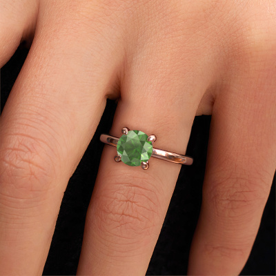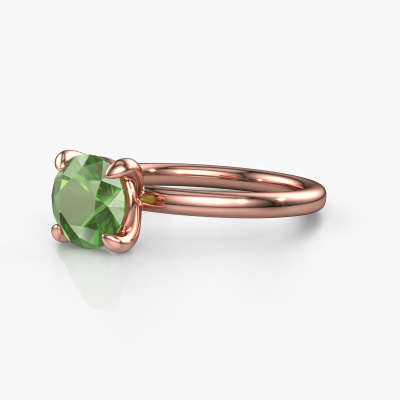 Bovenstaande verlovingsring heeft de naam Simone RND 1. Dit type verlovingsring noemen we een solitaire verlovingsring omdat hij een enkele edelsteen bevat. De verlovingsring is uitgevoerd in 14 karaat rosé goud en heeft een ronde toermalijn groen ter grootte van 7.3 mm. Deze schitterende klassieke rosé gouden solitaire ring heeft een prachtige ronde toermalijn groen om je aanzoek heel speciaal te maken. De open chatonzetting zorgt voor een prachtige lichtinval op de diamant. Wist je dat de diamant bijvoorbeeld symbool staat voor eeuwige liefde en trouw? Juist daarom is het een prachtige edelsteen om in het middelpunt te stellen. Onze goudsmid plaatst met veel zorgvuldigheid de gekozen edelsteen hoog op de ring, waardoor het een echte eyecatcher is. Ieder juweel is speciaal voor jou gemaakt, met aandacht voor detail en design.Door het gebruik van de modernste technieken, gecombineerd met ambachtelijk vakmanschap kunnen wij alle verlovingsringen zelf in ons atelier maken. Ieder sieraad wordt pas gemaakt nadat deze besteld is. Dit heeft als bijkomend voordeel dat we kunnen leveren tegen een prijs die je nergens anders tegenkomt.Ons team ontwerpt dagelijks nieuwe ringen in diverse stijlen. Heb je zelf een solitaire verlovingsring ergens gezien, die jij het liefst aan jouw geliefde zou willen geven? Je kunt altijd jouw ideeën en ontwerp met onze sieradenontwerpers bespreken, want wij zetten graag jouw ontwerp om tot een klassieke verlovingsring. Je kunt tijdens het ontwerpproces steeds meekijken, omdat het ontwerp in een zeer gedetailleerde 3D tekening wordt omgezet. Daarbij kun je een dummy bestellen van het uiteindelijke ontwerp. Een dummy is een kunststof ring, die precies dezelfde vormen heeft als jouw uiteindelijke ontwerp. Je kunt deze passen en zien of de ontworpen verlovingsring helemaal naar jouw wens is. Wij sturen je graag een vrijblijvende offerte, waarbij je ongetwijfeld versteld zult staan over de prijs en de kwaliteit van de ring en edelstenen.Om het voor jou makkelijker te maken kun je ieder besteld sieraad binnen 30 dagen na aflevering eenvoudig weer retour sturen.