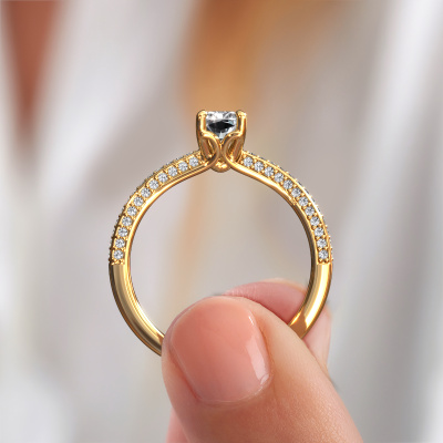 Deze verlovingsring heeft de naam Elenore rad. Deze gracieuze verlovingsring uitgevoerd, in 14 karaat goud is gezet met 0.946 crt diamant. Deze exclusieve gouden pavé solitaire verlovingsring is een puur staaltje vakmanschap! Alle kleine details zijn door onze goudsmid met veel geduld en passie vervaardigd. Dit ambacht vraagt een deskundig oog en vaardige hand om deze verlovingsring met uiterste precisie samen te stellen. En dat is precies waar onze goudsmeden enthousiast van worden! De prachtige diamanten zijn op een bijzondere manier gezet, zodat deze nog beter tot zijn recht komen. Dit geeft de verlovingsring extra allure. De verlovingsring is al uniek door zijn natuurlijke edelsteen, die we speciaal geselecteerd hebben voor deze ring. Daarnaast kun je zelf de samenstelling kiezen van het edelmetaal, waardoor je uiteindelijk een unieke verlovingsring hebt gecreëerd voor de meest exclusieve vrouw in je leven! Dit sieraad wordt met passie en liefde gemaakt door één van onze meestergoudsmeden.Onze goudsmeden vervaardigen pas je Elenore rad verlovingsring, zodra je deze besteld hebt. We hebben geen voorraden. Het voordeel hiervan is dat we de voorraad niet door hoeven te berekenen in de prijs, en kunnen daardoor sieraden leveren tegen een bijzonder lage prijs.Heb je zelf een speciale ring in gedachten, die je wellicht ergens gezien hebt? Je kunt je ideeën altijd met ons bespreken, wij zetten graag jouw ontwerp om tot een unieke verlovingsring. Het ontwerp kun je volgen, omdat wij met 3D tekeningen werken. Hierdoor krijg je al een realistische indruk van hoe jouw ontwerp er in het echt uit komt te zien. Wij sturen je graag een vrijblijvende offerte, waarbij je ongetwijfeld verwonderd zult zijn over de prijs in combinatie met de uitstekende kwaliteit die we aanbieden.Om het voor jou makkelijker te maken kun je ieder besteld sieraad binnen 30 dagen na aflevering eenvoudig weer retour sturen.