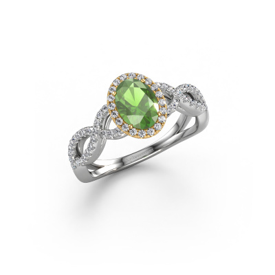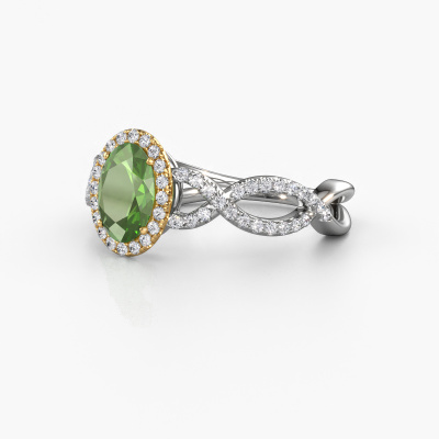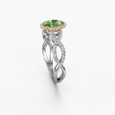 Deze verlovingsring heeft de naam Dionne ovl. Deze getordeerde verlovingsring uitgevoerd, in 14 karaat witgoud is gezet met 7x5 mm toermalijn groen. Deze exclusieve witgouden pavé solitaire verlovingsring is een puur staaltje vakmanschap! Alle kleine details zijn door onze goudsmid met veel geduld en passie vervaardigd. Dit ambacht vraagt een deskundig oog en vaardige hand om deze verlovingsring met uiterste precisie samen te stellen. En dat is precies waar onze goudsmeden enthousiast van worden! De prachtige toermalijn groen zijn op een bijzondere manier gezet, zodat deze nog beter tot zijn recht komen. Dit geeft de verlovingsring extra allure. De verlovingsring is al uniek door zijn natuurlijke edelsteen, die we speciaal geselecteerd hebben voor deze ring. Daarnaast kun je zelf de samenstelling kiezen van het edelmetaal, waardoor je uiteindelijk een unieke verlovingsring hebt gecreëerd voor de meest exclusieve vrouw in je leven! Dit sieraad is uniek, doordat je deze ring geheel naar eigen wensen kunt samenstellen.Onze goudsmeden vervaardigen pas je Dionne ovl verlovingsring, zodra je deze besteld hebt. We hebben geen voorraden. Het voordeel hiervan is dat we de voorraad niet door hoeven te berekenen in de prijs, en kunnen daardoor sieraden leveren tegen een bijzonder lage prijs.Ons team ontwerpt dagelijks nieuwe ringen in diverse stijlen. Heb je zelf een pavé solitaire verlovingsring ergens gezien, die jij het liefst aan jouw geliefde zou willen geven? Je kunt altijd jouw ideeën en ontwerp met onze sieradenontwerpers bespreken, want wij zetten graag jouw ontwerp om tot een exclusieve verlovingsring. Je kunt tijdens het ontwerpproces steeds meekijken, omdat het ontwerp in een zeer gedetailleerde 3D tekening wordt omgezet. Daarbij kun je een dummy bestellen van het uiteindelijke ontwerp. Een dummy is een kunststof ring, die precies dezelfde vormen heeft als jouw uiteindelijke ontwerp. Je kunt deze passen en zien of de ontworpen verlovingsring helemaal naar jouw wens is. Wij sturen je graag een vrijblijvende offerte, waarbij je ongetwijfeld versteld zult staan over de prijs en de kwaliteit van de ring en edelstenen.Om het voor jou makkelijker te maken kun je ieder besteld sieraad binnen 30 dagen na aflevering eenvoudig weer retour sturen.