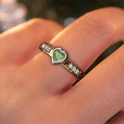 Deze verlovingsring heeft de naam Lieke Heart. Hij is uitgevoerd in 14 karaat goud en gezet met toermalijn groen. Ga jij graag mee met eigentijdse trends? En wil je dit ook terug laten komen in je keuze voor een unieke verlovingsring? Deze hartjes verlovingsring is een bijzondere ring, die je zelf naar jouw of haar stijl verder kunt aanpassen. In deze trendy gouden verlovingsring is toermalijn groen verwerkt. Deze toermalijn groen zijn speciaal voor deze verlovingsring geselecteerd, om het mooiste effect te creëren. Onze goudsmid vervaardigt jouw verlovingsring in ons eigen atelier, en plaatst de toermalijn groen heel zorgvuldig in de ring. Vervolgens wordt deze bijgewerkt en gepolijst totdat de perfecte verlovingsring is ontstaan, perfect voor de liefde van jouw leven! Dit sieraad is uniek, doordat je deze ring geheel naar eigen wensen kunt samenstellen.Wist je dat we een beste prijs garantie geven voor jouw verlovingsring? Dit is mogelijk omdat al onze sieraden met de hand gemaakt worden in ons eigen atelier. We hebben geen dure voorraden, en we maken pas je verlovingsring op het moment dat je besteld hebt. Doordat we de hele productie zelf in de hand hebben, kunnen wij je goed informeren over alle eigenschappen van deze ring. Juist omdat het kopen van een verlovingsring online spannend is, begrijpen wij dat het fijn is om alle kenmerken te weten van jouw ring.Ons team ontwerpt dagelijks nieuwe ringen in diverse stijlen. Heb je zelf een pavé solitaire verlovingsring ergens gezien, die jij het liefst aan jouw geliefde zou willen geven? Je kunt altijd jouw ideeën en ontwerp met onze sieradenontwerpers bespreken, want wij zetten graag jouw ontwerp om tot een trendy verlovingsring. Je kunt tijdens het ontwerpproces steeds meekijken, omdat het ontwerp in een zeer gedetailleerde 3D tekening wordt omgezet. Daarbij kun je een dummy bestellen van het uiteindelijke ontwerp. Een dummy is een kunststof ring, die precies dezelfde vormen heeft als jouw uiteindelijke ontwerp. Je kunt deze passen en zien of de ontworpen verlovingsring helemaal naar jouw wens is. Wij sturen je graag een vrijblijvende offerte, waarbij je ongetwijfeld versteld zult staan over de prijs en de kwaliteit van de ring en edelstenen.Om het voor jou makkelijker te maken kun je ieder besteld sieraad binnen 30 dagen na aflevering eenvoudig weer retour sturen.