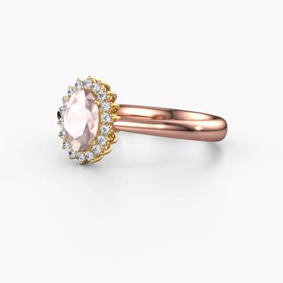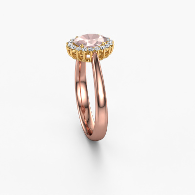 Bovenstaande verlovingsring heeft de naam Tilly ovl 1. Dit type verlovingsring noemen we een entourage ring, hierbij worden rondom de middensteen in een open zetting allemaal kleine edelstenen gezet. Deze verlovingsring uitgevoerd in 14 karaat rosé goud heeft een ovale morganiet champagne van 7x5 mm als center steen met daaromheen kleine lab grown diamanten. Het opvallende aan deze klassieke rosé gouden entourage verlovingsring is de vorm: de kleine edelstenen vormen samen met de morganiet champagne een prachtige bloem, die lijkt samen te smelten tot één fonkelende edelsteen. Deze verlovingsring wordt ook wel de flower of de rozet verlovingsring genoemd. Onze meestergoudsmeden zorgen ervoor dat de kleinere lab grown diamanten allen op dezelfde manier geplaatst worden, zodat het licht niet onderbroken wordt in de morganiet champagne en er inderdaad een prachtige eenheid gecreëerd wordt. Met een geoefend oog en een vaardige hand wordt iedere zorgvuldig geselecteerde morganiet champagne in de verlovingsring geplaatst. Steeds opnieuw wordt de verlovingsring onder de loep gehouden om te zien of het speciale effect nog steeds zichtbaar is. Het resultaat is een unieke verlovingsring, waarbij de gekozen morganiet champagne letterlijk het stralende middelpunt wordt. Wat een prachtige, betekenisvolle verlovingsring om te geven aan het stralende middelpunt in jouw leven! Door het gebruik van de modernste technieken, gecombineerd met ambachtelijk vakmanschap kunnen wij alle verlovingsringen zelf in ons atelier maken. Ieder sieraad wordt pas gemaakt nadat deze besteld is. Dit heeft als bijkomend voordeel dat we kunnen leveren tegen een prijs die je nergens anders tegenkomt.Heb je zelf een speciale ring in gedachten, die je wellicht ergens gezien hebt? Je kunt je ideeën altijd met ons bespreken, wij zetten graag jouw ontwerp om tot een unieke verlovingsring. Het ontwerp kun je volgen, omdat wij met 3D tekeningen werken. Hierdoor krijg je al een realistische indruk van hoe jouw ontwerp er in het echt uit komt te zien. Wij sturen je graag een vrijblijvende offerte, waarbij je ongetwijfeld verwonderd zult zijn over de prijs in combinatie met de uitstekende kwaliteit die we aanbieden.Om het voor jou makkelijker te maken kun je ieder besteld sieraad binnen 30 dagen na aflevering eenvoudig weer retour sturen.