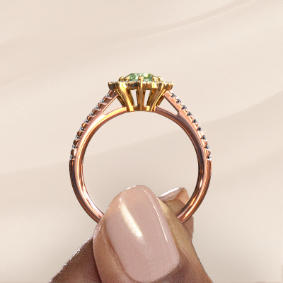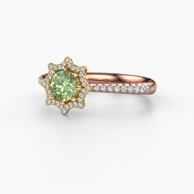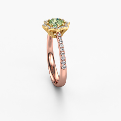 Deze aanzoeksring heeft de naam Zena. Deze aanzoeksring uitgevoerd in 14 karaat rosé goud is gezet met groene lab grown diamant. Een bijzondere rosé gouden vintage ring, deze unieke aanzoeksring die jouw liefde van je leven zeker laat stralen! En