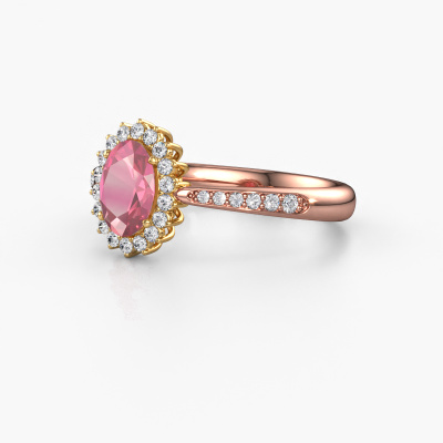 Bovenstaande verlovingsring heeft de naam Tilly ovl 2. Dit type verlovingsring noemen we een entourage ring, hierbij worden rondom de middensteen in een open zetting allemaal kleine edelstenen gezet. Deze verlovingsring uitgevoerd in 14 karaat rosé goud heeft een ovale tourmalijn pink van 7x5 mm als center steen met daaromheen kleine lab grown diamanten. Als je naar deze rosé gouden entourage verlovingsring kijkt, krijg je het idee dat de kleinere edelstenen samen met de grote tourmalijn pink tot één grote fonkelende edelsteen samensmelten, in de vorm van een prachtige bloem. Een andere naam voor deze klassieke verlovingsring is hierdoor ook wel de flower of de rozet ring. Deze kleinere lab grown diamanten moeten dan echter wel allen op eenzelfde manier geplaatst zijn, zodat het licht in de tourmalijn pink niet onderbroken wordt en er inderdaad een prachtige eenheid gecreëerd wordt. En daar zorgen onze meestergoudsmeden voor. Met uiterste precisie wordt iedere zorgvuldig geselecteerde tourmalijn pink met de hand in de verlovingsring geplaatst. Steeds opnieuw wordt de verlovingsring onder de loep gehouden om te zien of het speciale effect nog steeds zichtbaar is. Door onze modernste technieken kunnen wij met uiterste precisie prachtige sieraden te ontwerpen en voor jou personaliseren in de hoogste juwelierskwaliteit. Tegelijkertijd zijn onze verlovingsringen altijd 30% goedkoper dan bij een andere juwelier. Dit komt doordat alle verlovingsringen pas vervaardigd worden op het moment dat deze besteld wordt en we daardoor geen dure voorraden hoeven te hanteren. Mocht je aan een bepaald budget gebonden zijn, kunnen we je graag adviseren welke combinatie je het beste kunt kiezen.Ons team ontwerpt dagelijks nieuwe ringen in diverse stijlen. Heb je zelf een entourage verlovingsring ergens gezien, die jij het liefst aan jouw geliefde zou willen geven? Je kunt altijd jouw ideeën en ontwerp met onze sieradenontwerpers bespreken, want wij zetten graag jouw ontwerp om tot een klassieke verlovingsring. Je kunt tijdens het ontwerpproces steeds meekijken, omdat het ontwerp in een zeer gedetailleerde 3D tekening wordt omgezet. Daarbij kun je een dummy bestellen van het uiteindelijke ontwerp. Een dummy is een kunststof ring, die precies dezelfde vormen heeft als jouw uiteindelijke ontwerp. Je kunt deze passen en zien of de ontworpen verlovingsring helemaal naar jouw wens is. Wij sturen je graag een vrijblijvende offerte, waarbij je ongetwijfeld versteld zult staan over de prijs en de kwaliteit van de ring en edelstenen.Om het voor jou makkelijker te maken kun je ieder besteld sieraad binnen 30 dagen na aflevering eenvoudig weer retour sturen.