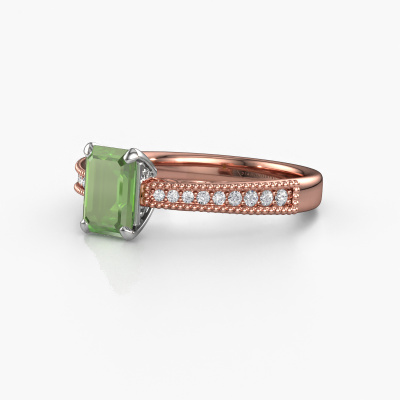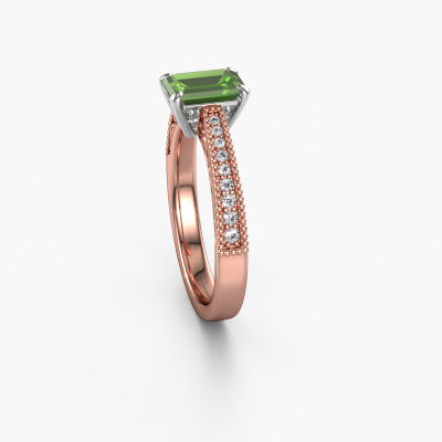 Deze verlovingsring heeft de naam Shonta EME. Deze verlovingsring uitgevoerd in 14 karaat rosé goud is gezet met toermalijn groen. Een bijzondere rosé gouden vintage ring, deze unieke verlovingsring die jouw liefde van je leven zeker laat stralen! En dat is precies waar wij voor gaan. In deze vintage verlovingsring zijn prachtige toermalijn groen verwerkt. Je kunt natuurlijk iedere edelsteen die wij aanbieden hierin laten verwerken. De edelsteen is zorgvuldig geselecteerd, want wij vinden dat op jouw verlovingsring alleen de mooiste edelsteen mag schitteren, toch? Onze goudsmid vervaardigt jouw verlovingsring in ons eigen atelier, en plaatst de toermalijn groen met uiterste precisie in de ring. Vervolgens wordt deze bijgewerkt en gepolijst totdat het resultaat zichtbaar is: de perfecte verlovingsring voor de liefde van jouw leven! Dit sieraad is gemaakt door een team van gedreven goudsmeden en designers. Hierdoor zal dit unieke pronkstuk een echte eyecatcher zijn.Wellicht is het je opgevallen dat onze prijzen gemiddeld 30% lager liggen dan bij een andere juwelier. En dat terwijl de kwaliteit in de meeste gevallen nog beter is! Dit komt doordat onze goudsmeden je verlovingsring direct in ons eigen atelier vervaardigen. Hierdoor hoeven we geen dure voorraden te hanteren en kunnen we ieder gewenst detail direct op jouw verlovingsring aanbrengen.Heb je zelf een specifieke verlovingsring ergens gezien, die je graag aan jouw geliefde zou willen geven? Bespreek gerust jouw ideeën met onze sieradenontwerpers, want wij zetten graag jouw ontwerp om tot een vintage verlovingsring. Je kunt tijdens het ontwerpproces steeds meekijken, omdat wij met 3D tekeningen werken. Je krijgt hierdoor al een realistische indruk van hoe jouw ontwerp er in werkelijkheid uit komt te zien. Daarbij kun je een dummy vooraf bestellen. Een dummy is een kunststof ring, die precies dezelfde vormen heeft als jouw uiteindelijke ontwerp. Je kunt deze passen en zien of de breedte en dikte bijvoorbeeld naar wens zijn. Wij sturen je graag een vrijblijvende offerte, waarbij je ongetwijfeld versteld zult staan over de prijs en de kwaliteit van de ring en edelstenen.Om het voor jou makkelijker te maken kun je ieder besteld sieraad binnen 30 dagen na aflevering eenvoudig weer retour sturen.