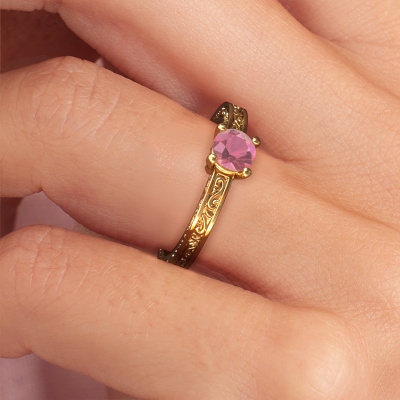 Deze verlovingsring heeft de naam Claudette 1. Deze sierlijke verlovingsring uitgevoerd in 14 karaat goud is gezet met 5 mm tourmalijn pink. Heeft jouw vriendin een zwak voor vintage? Dan kun je er vrijwel zeker van zijn dat deze gouden verlovingsring helemaal bij haar stijl zal passen! Een nieuw model, gebaseerd op Keltische motieven. Ietwat dromerig, een prachtig ontwerp! Zeker als je deze nog verder aangepast naar jullie smaak. In deze Keltische solitaire verlovingsring zijn prachtige tourmalijn pink verwerkt. Zoals je ziet kun je zelf voor een edelsteen kiezen die jij bij je vriendin vindt passen. Iedere edelsteen wordt zorgvuldig geselecteerd bij onze handelaren wereldwijd, onze goudsmid wil alleen de mooiste edelstenen op een sieraad verwerken. Het is immers de kroon op zijn werk! Ieder juweel is uniek, doordat je deze ring geheel naar eigen wensen kunt samenstellen.Onze goudsmeden vervaardigen pas je Claudette 1 verlovingsring, zodra je deze besteld hebt. We hebben geen voorraden. Het voordeel hiervan is dat we de voorraad niet door hoeven te berekenen in de prijs, en kunnen daardoor sieraden leveren tegen een bijzonder lage prijs.Ons team is iedere dag weer bezig om nieuwe ontwerpen toe te voegen, in samenwerking met onze designers en goudsmeden wordt gekeken hoe we tot het mooiste ontwerp kunnen komen. Wij doen ons best om tot een zo gevarieerd mogelijk aanbod te komen. Wellicht heb je zelf al een mooi idee van een sieraad dat je ooit wel eens gezien hebt. Neem dan eens vrijblijvend contact met ons op. Wij maken een offerte voor je op waarbij wij vrij zeker zijn dat we wat betreft kwaliteit en prijs jou versteld zullen laten staan.Om het voor jou makkelijker te maken kun je ieder besteld sieraad binnen 30 dagen na aflevering eenvoudig weer retour sturen.