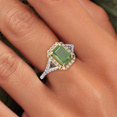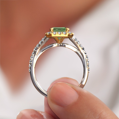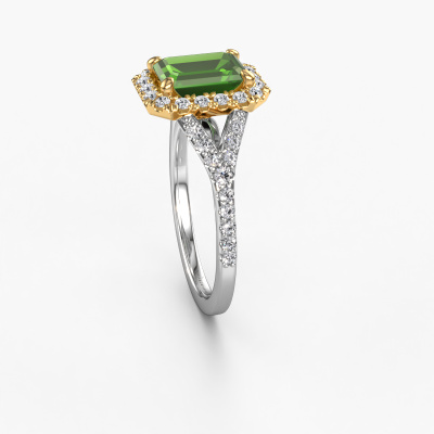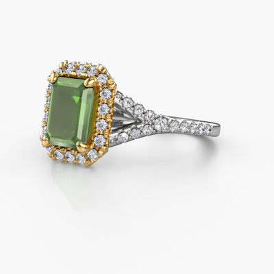 Bovenstaande verlovingsring heeft de naam Kimber EME. Dit type verlovingsring noemen we een pavé solitaire verlovingsring omdat hij een enkele middensteen heeft waarbij de banden van de verlovingsring ook volgezet zijn. De verlovingsring is uitgevoerd in de combinatie 14 karaat witgoud met goud en heeft als middensteen een smaragd geslepen toermalijn groen ter grootte van 8x6 mm en in de zijbanden zijn lab grown diamanten gezet. Ieder juweel is gemaakt door een team van gedreven goudsmeden en designers. Hierdoor zal dit unieke pronkstuk een echte eyecatcher zijn.Deze exclusieve witgouden pavé solitaire verlovingsring heeft een schitterende smaragd geslepen toermalijn groen als centersteen, waarbij in de band nog meer toermalijn groen zijn gezet om de middensteen nog meer te accentueren. Doordat de zetting van de pootjes om de toermalijn groen open is, vangt de toermalijn groen het licht van alle kanten op en schittert hierdoor optimaal. Hierboven kun je zien hoe onze goudsmid de verlovingsring heel precies tot in de kleinste details heeft bewerkt, zodat de wat hoger gelegen toermalijn groen een echte eyecatcher is. Wat een prachtige verlovingsring om te geven bij je aanzoek aan de liefde van jouw leven, aan jouw stralende middelpunt!Door het gebruik van de modernste technieken, gecombineerd met ambachtelijk vakmanschap kunnen wij alle verlovingsringen zelf in ons atelier maken. Ieder sieraad wordt pas gemaakt nadat deze besteld is. Dit heeft als bijkomend voordeel dat we kunnen leveren tegen een prijs die je nergens anders tegenkomt.Iedere dag is ons team van goudsmeden en sieradenontwerpers aan het werk om nieuwe sieraden te ontwerpen. Het kan zijn dat je ergens een mooie verlovingsring gezien hebt en deze graag zou laten verwerken tot jouw unieke ring. Neem in dat geval contact met ons op en we zullen je een aanbod doen, waar je vrijwel zeker verwonderd zult zijn over de prijs en de kwaliteit.Om het voor jou makkelijker te maken kun je ieder besteld sieraad binnen 30 dagen na aflevering eenvoudig weer retour sturen.