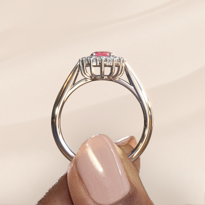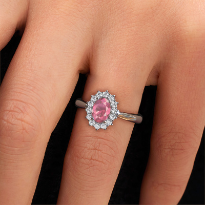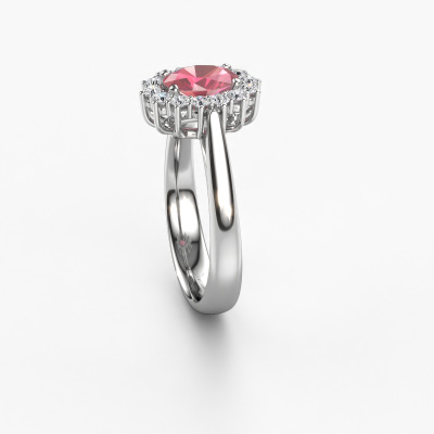 Bovenstaande verlovingsring heeft de naam Margien 1. Dit type verlovingsring noemen we een Lady Diana ring, hierbij worden rondom de middensteen in een open zetting allemaal kleine edelstenen gezet. Deze verlovingsring uitgevoerd in 14 karaat witgoud heeft een ovale tourmalijn pink van 7x5 mm als center steen met daaromheen kleine diamanten. Je kent hem wel, deze prachtige traditionele witgouden Lady Diana Ring... de bekendste en meest besproken verlovingsring ter wereld speciaal voor de meest bijzondere persoon in jouw leven! Heel speciaal aan deze Lady Diana verlovingsring is de prachtige tourmalijn pink in het midden. De kleinere edelstenen in de verlovingsring om de tourmalijn pink heen versterken de schittering van de middelste steen, waardoor het lijkt alsof je één grote edelsteen draagt. Bij het ontwerp van deze Lady Di verlovingsring wordt dit effect nog meer bekrachtigd. Het bijzondere is, dat onze goudsmeden deze verlovingsring graag voor jou uniek vervaardigen. Doordat de Lady Diana verlovingsring met de hand gemaakt wordt in ons eigen atelier beneden, kunnen wij deze aanpassen zoals jij in gedachten hebt. Dit sieraad wordt speciaal voor jou gemaakt door onze meester goudsmeden in ons eigen atelier.Onze goudsmeden vervaardigen pas je Margien 1 verlovingsring, zodra je deze besteld hebt. We hebben geen voorraden. Het voordeel hiervan is dat we de voorraad niet door hoeven te berekenen in de prijs, en kunnen daardoor sieraden leveren tegen een bijzonder lage prijs.Iedere dag is ons team van goudsmeden en sieradenontwerpers aan het werk om nieuwe sieraden te creëren. Het kan zijn dat je ergens een traditionele verlovingsring gezien hebt, die je als basis wilt nemen bij het ontwerpen van jouw unieke ring. Neem gerust contact met ons op en we zullen je een aanbod doen, waar je vrijwel zeker verwonderd zult zijn over de kwaliteit en de prijs.Om het voor jou makkelijker te maken kun je ieder besteld sieraad binnen 30 dagen na aflevering eenvoudig weer retour sturen.