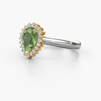 Bovenstaande verlovingsring heeft de naam Tilly per 1. Dit type verlovingsring noemen we een entourage ring, hierbij worden rondom de middensteen in een open zetting allemaal kleine edelstenen gezet. Deze verlovingsring uitgevoerd in 14 karaat witgoud heeft een peer toermalijn groen van 8x6 mm als center steen met daaromheen kleine diamanten. Het opvallende aan deze exclusieve witgouden entourage verlovingsring is de vorm: de kleine edelstenen vormen samen met de toermalijn groen een prachtige bloem, die lijkt samen te smelten tot één fonkelende edelsteen. Deze verlovingsring wordt ook wel de flower of de rozet verlovingsring genoemd. Onze meestergoudsmeden zorgen ervoor dat de kleinere diamanten allen op dezelfde manier geplaatst worden, zodat het licht niet onderbroken wordt in de toermalijn groen en er inderdaad een prachtige eenheid gecreëerd wordt. Met een geoefend oog en een vaardige hand wordt iedere zorgvuldig geselecteerde toermalijn groen in de verlovingsring geplaatst. Steeds opnieuw wordt de verlovingsring onder de loep gehouden om te zien of het speciale effect nog steeds zichtbaar is. Het resultaat is een unieke verlovingsring, waarbij de gekozen toermalijn groen letterlijk het stralende middelpunt wordt. Wat een prachtige, betekenisvolle verlovingsring om te geven aan het stralende middelpunt in jouw leven! Onze goudsmeden vervaardigen pas je Tilly per 1 verlovingsring, zodra je deze besteld hebt. We hebben geen voorraden. Het voordeel hiervan is dat we de voorraad niet door hoeven te berekenen in de prijs, en kunnen daardoor sieraden leveren tegen een bijzonder lage prijs.Iedere dag is ons team van goudsmeden en sieradenontwerpers aan het werk om nieuwe sieraden te ontwerpen. Het kan zijn dat je ergens een mooie verlovingsring gezien hebt en deze graag zou laten verwerken tot jouw unieke ring. Neem in dat geval contact met ons op en we zullen je een aanbod doen, waar je vrijwel zeker verwonderd zult zijn over de prijs en de kwaliteit.Om het voor jou makkelijker te maken kun je ieder besteld sieraad binnen 30 dagen na aflevering eenvoudig weer retour sturen.