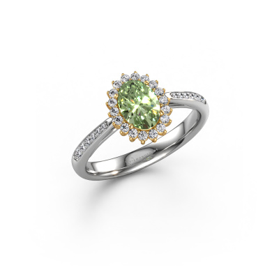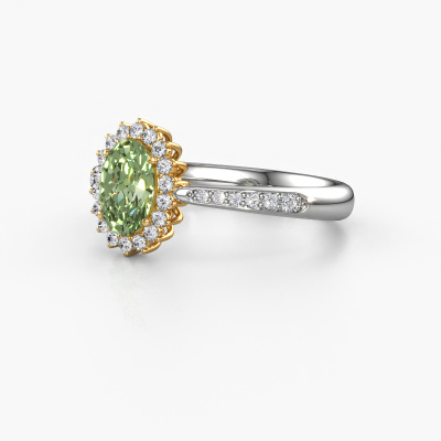 Bovenstaande verlovingsring heeft de naam Tilly ovl 2. Dit type verlovingsring noemen we een entourage ring, hierbij worden rondom de middensteen in een open zetting allemaal kleine edelstenen gezet. Deze verlovingsring uitgevoerd in 14 karaat witgoud heeft een ovale groene lab grown diamant van 7x5 mm als center steen met daaromheen kleine lab grown diamanten. Als je naar deze witgouden entourage verlovingsring kijkt, krijg je het idee dat de kleinere edelstenen samen met de grote groene lab grown diamant tot één grote fonkelende edelsteen samensmelten, in de vorm van een prachtige bloem. Een andere naam voor deze klassieke verlovingsring is hierdoor ook wel de flower of de rozet ring. Deze kleinere lab grown diamanten moeten dan echter wel allen op eenzelfde manier geplaatst zijn, zodat het licht in de groene lab grown diamant niet onderbroken wordt en er inderdaad een prachtige eenheid gecreëerd wordt. En daar zorgen onze meestergoudsmeden voor. Met uiterste precisie wordt iedere zorgvuldig geselecteerde groene lab grown diamant met de hand in de verlovingsring geplaatst. Steeds opnieuw wordt de verlovingsring onder de loep gehouden om te zien of het speciale effect nog steeds zichtbaar is. Door onze modernste technieken kunnen wij met uiterste precisie prachtige sieraden te ontwerpen en voor jou personaliseren in de hoogste juwelierskwaliteit. Tegelijkertijd zijn onze verlovingsringen altijd 30% goedkoper dan bij een andere juwelier. Dit komt doordat alle verlovingsringen pas vervaardigd worden op het moment dat deze besteld wordt en we daardoor geen dure voorraden hoeven te hanteren. Mocht je aan een bepaald budget gebonden zijn, kunnen we je graag adviseren welke combinatie je het beste kunt kiezen.Ons team ontwerpt dagelijks nieuwe ringen in diverse stijlen. Heb je zelf een entourage verlovingsring ergens gezien, die jij het liefst aan jouw geliefde zou willen geven? Je kunt altijd jouw ideeën en ontwerp met onze sieradenontwerpers bespreken, want wij zetten graag jouw ontwerp om tot een klassieke verlovingsring. Je kunt tijdens het ontwerpproces steeds meekijken, omdat het ontwerp in een zeer gedetailleerde 3D tekening wordt omgezet. Daarbij kun je een dummy bestellen van het uiteindelijke ontwerp. Een dummy is een kunststof ring, die precies dezelfde vormen heeft als jouw uiteindelijke ontwerp. Je kunt deze passen en zien of de ontworpen verlovingsring helemaal naar jouw wens is. Wij sturen je graag een vrijblijvende offerte, waarbij je ongetwijfeld versteld zult staan over de prijs en de kwaliteit van de ring en edelstenen.Om het voor jou makkelijker te maken kun je ieder besteld sieraad binnen 30 dagen na aflevering eenvoudig weer retour sturen.